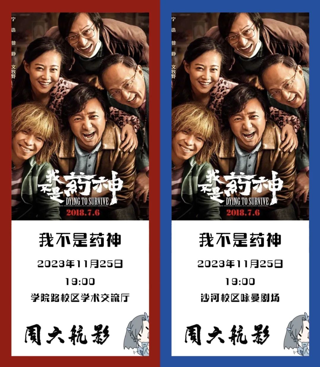 11月25日(周六)19:00,,,,,《我不是药神》将于学院路校区学术交流厅和沙河校区咏曼剧场同步放映。。。。。。