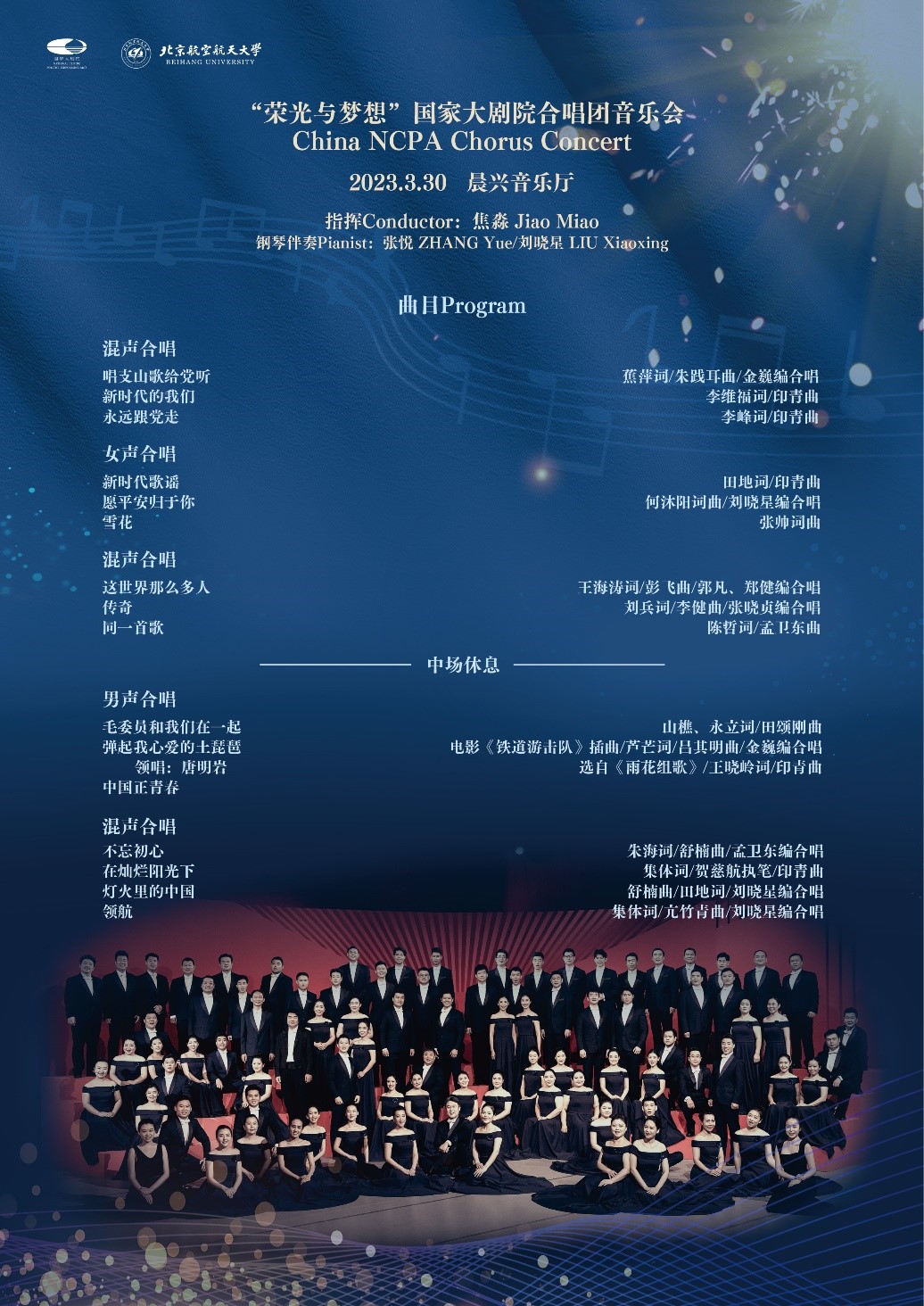 3月30日(周四)19:30,,,,驻团指挥焦淼携手国家大剧院合唱团在888集团学院路校区晨兴音乐厅为师生带来一场关于“荣光与梦想”的盛世欢歌,,,,本场音乐会既有传唱红色经典、弘扬主旋律的歌曲,,,,更有国家大剧院合唱团全新打造、编创的最新力作,,,,也是新时代展望未来的文艺新声。。。。。。。