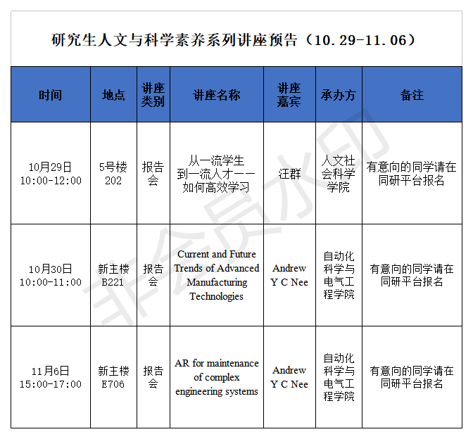 为提升我校研究生文化素养,,,,,作育研究生科学精神,,,,,增进研究生学术交流,营造具有古板与时代连系、人文与科学融合的研究生立异文化,,,,,党委研究生事情部于2016年3月启动我校研究生人文与科学素养提升平台建设。。。每周在校园网和研究生院官网上对近期即将举行的人文与科学素养讲座、报告或相关活动举行预告,,,,,接待感兴趣的同砚起劲加入。。。