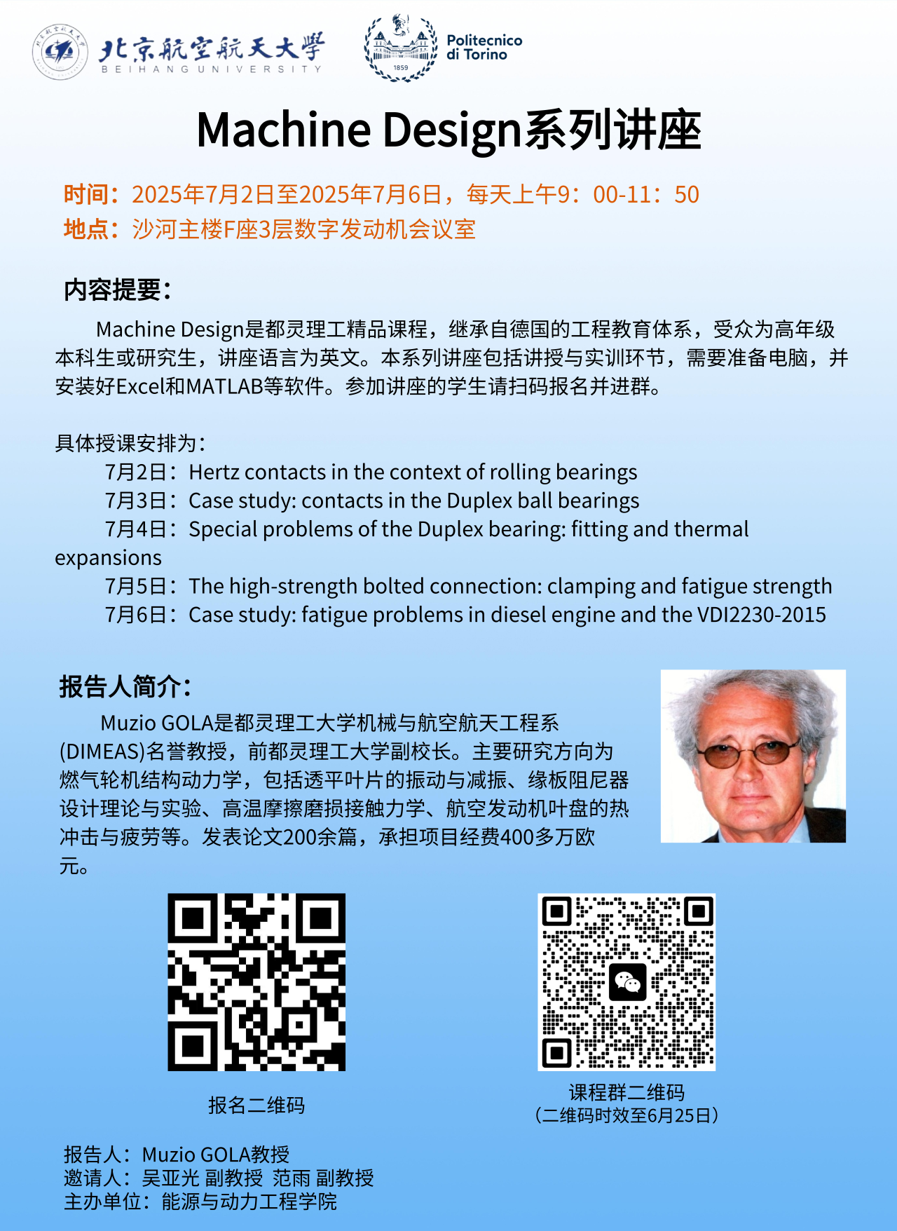 Machine Design是都灵理工精品课程,,,,继续自德国的工程教育系统,,,,受众为高年级本科生或研究生,,,,讲座语言为英文。。。。。本系列讲座包括教学与实训环节,,,,需要准备电脑,,,,并装置好Excel和MATLAB等软件。。。。。加入讲座的学生请扫码报名并进群(详见附件海报)。。。。。