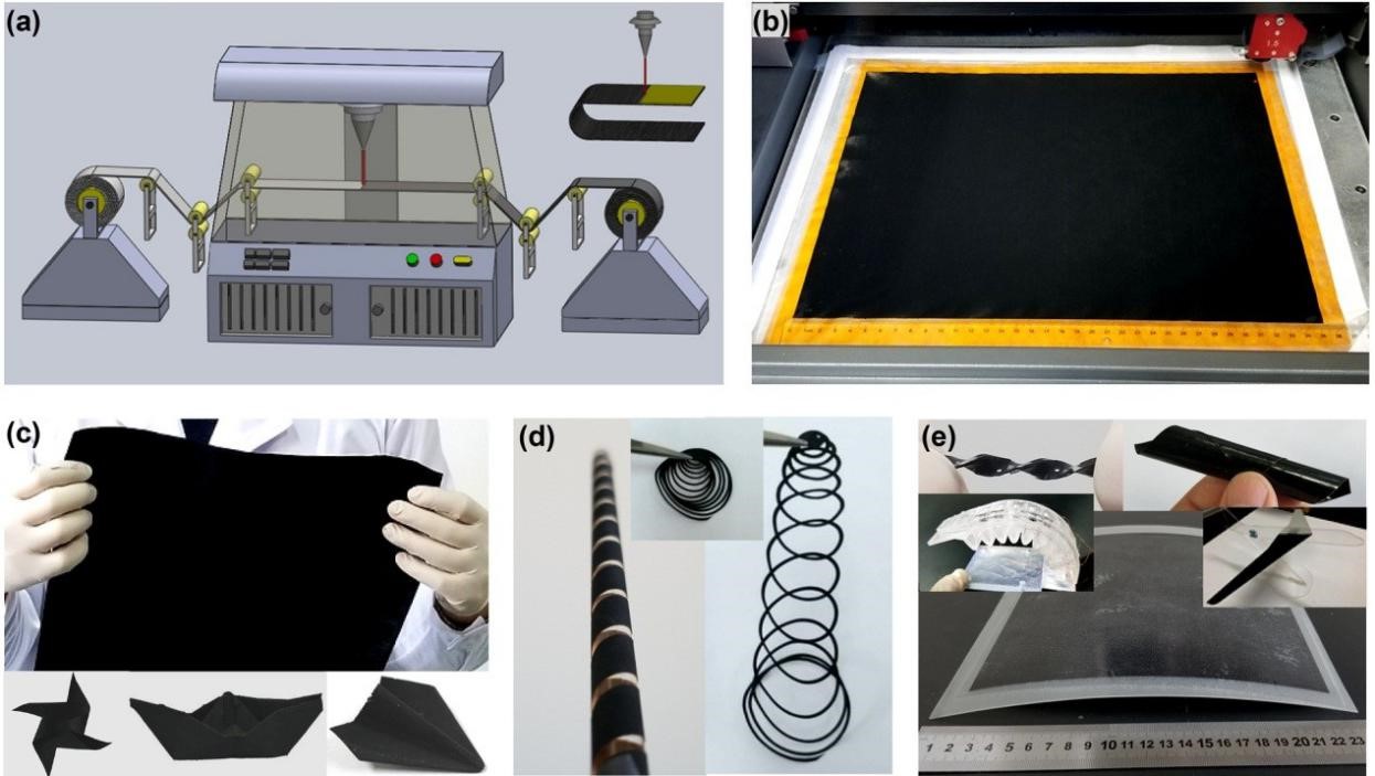 图1. 石墨烯纸的先进激光一连制造及多模式形态加工